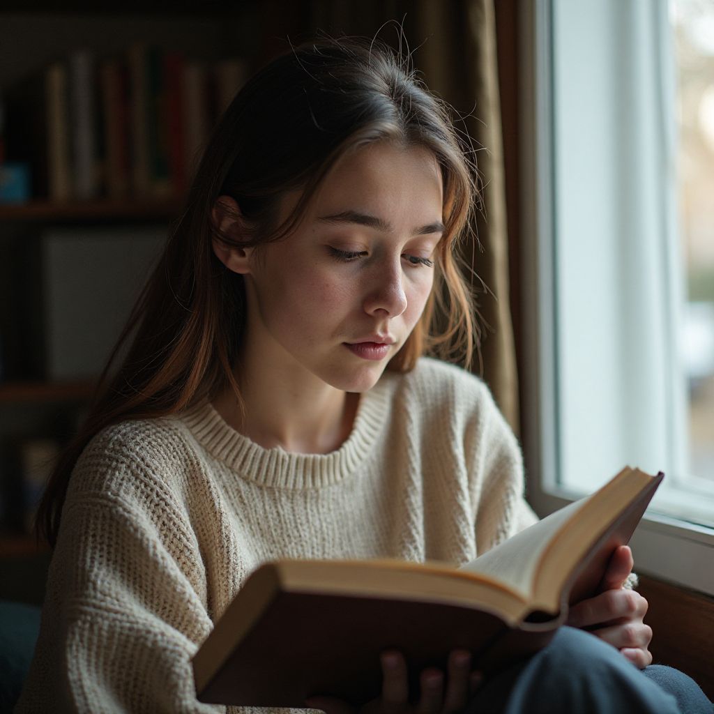 Wanita membaca buku fisik saat jam tanpa layar